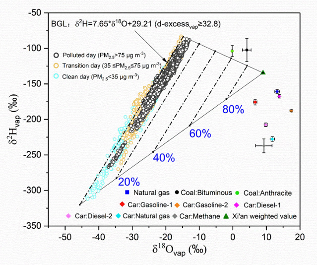 为此,他们在西安市收集了三个采暖季的大气水汽同位素组成及相关大气化学与气象观测数据。结果显示在重雾霾天气,大气水汽氢氧同位素的组成特征确实显现出燃烧源水汽的贡献(图1),这一贡献平均为6.2%。利用大气化学WRF-Chem模型,研究人员又进一步定量估计了燃烧源水汽对于大气PM2.5 浓度的贡献。典型重污染天气的模拟结果表明,燃烧源水汽的平均贡献占西安区域大气总PM2.5的2.8%,占人为源PM2.5的5.1%。考虑到在产生同等热量前提下,燃烧天然气生成的水汽质量是烧煤生成水汽的近3倍,作者建议在大范围实施煤改气工程时应考虑燃烧源水汽排放引起PM2.5增加这一负面影响,尤其是在一些对相对湿度比较敏感的气象条件下。在条件成熟时,未来仍需考虑电能或清洁能源的使用。