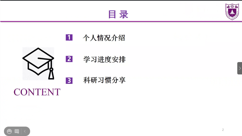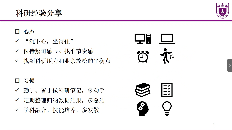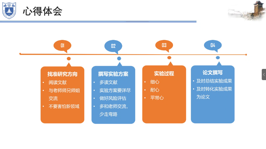 首先,博士生第三党支部的王文琪师姐从个人情况介绍、学习进度安排和科研习惯分享三方面与大家进行科研经验的交流。在个人情况介绍部分,师姐向我们介绍了她直博五年以来的科研成果、参与项目及参与会议情况。在学习进度安排方面,师姐将读博分为积累准备、钻研打磨和提升总结三个阶段供大家参考。最后,在科研经验方面,师姐从心态和习惯两方面进行了分享。在心态上,要能“沉下心,坐得住”,保持紧迫感的同时找准节奏感,并且能够找到科研压力和业余放松的平衡点。在习惯上,要多动手、多总结、多发散,善于、勤于做笔记,定期整理归纳数据结果,注重学科融合和技能培养。