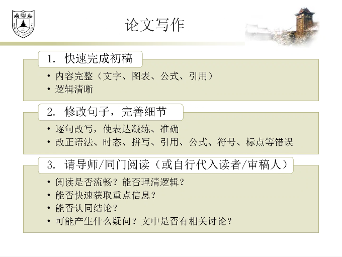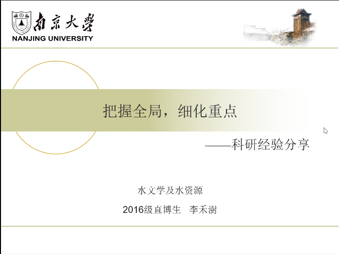之后,博士生第三党支部的李禾澍师姐以“把握全局,细化重点”为题,从对科研的理解和认识、文献阅读、研究过程和论文写作四个方面进行了分享。在对科研的理解和认识上,师姐讲到,科研的目的在于解决和回答科学问题,科研的关键在于创新,科研的要求在于掌握方法技能和通过论文的方式集中呈现过程、分析和结果。在文献阅读方面,师姐以“基于信息熵的水文站网优化”为例,告诉大家通过文献了解自己的研究问题或方向在研究领域内的认可度和进展,并指出综述文章、引用量大的文章、近5年在顶级期刊发表的文章和同研究方向相似度高的文章值得精读。在研究过程中,师姐认为有四个方面值得注意。首先,要充分利用平台的优势、经验、资源和成果,并将主要工作量放在文章的核心部分,以此达到调用资源,提高效率的目的;其次,要提高后期意识,在研究过程中做好记录,便于后期查找问题和修改;第三要做好文件管理;最后要保持严谨的科学态度,严格遵循方法和技术的使用条件,保证原理不出错,基本假设成立,并充分考虑各步骤中的影响因素对结果可信度的影响。在论文写作时,师姐的方法是快速完成初稿后,修改句子,完善细节,最后请导师或同门阅读提出建议,并进行修改。