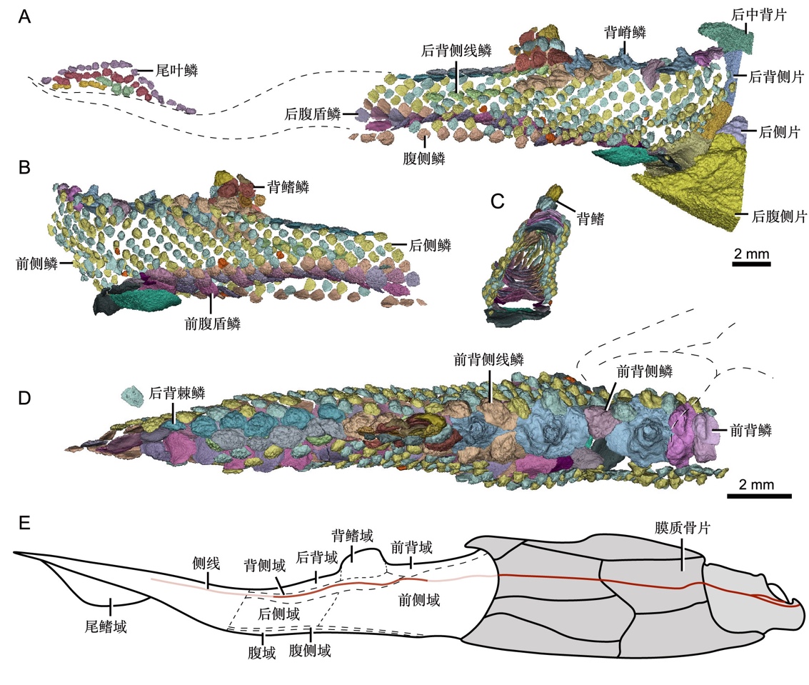 副云南鱼化石扫描结果展示了最原始有颌脊椎动物的完整鳞列。它的背鳍和尾鳍都被厚重的膜质鳞片完全覆盖。扫描显示,副云南鱼鳞片形态具有相当大的分异度,以及复杂的区域分化。同一个体的鳞片在轮廓、膜质骨表面纹饰、冠部比例、覆压方式、大小等形态特征上展现出极大的多样性(图3)。此外,沿着身体纵轴向后,鳞片在不同区域展现出不同的梯度特征,特别是侧鳞沿着身体纵轴向后鳞片逐渐变大,这与绝大多数硬骨鱼相反,并且鳞片由彼此强烈覆压(硬骨鱼鳞片普遍特征)逐渐转变为不覆压(软骨鱼普遍特征)。有意思的是,上述鳞列的分化情况在胴甲鱼类进步类群化石中发生了简化,只有在胴甲鱼类的原始类群中才能观察到这些现象。已知鳞片分区的简化也分别独立地发生在软骨鱼支系、硬骨鱼中的肉鳍鱼和辐鳍鱼支系中。因此,副云南鱼就成为了解有颌脊椎动物祖先鳞列格局最重要的一扇“窗口”。
