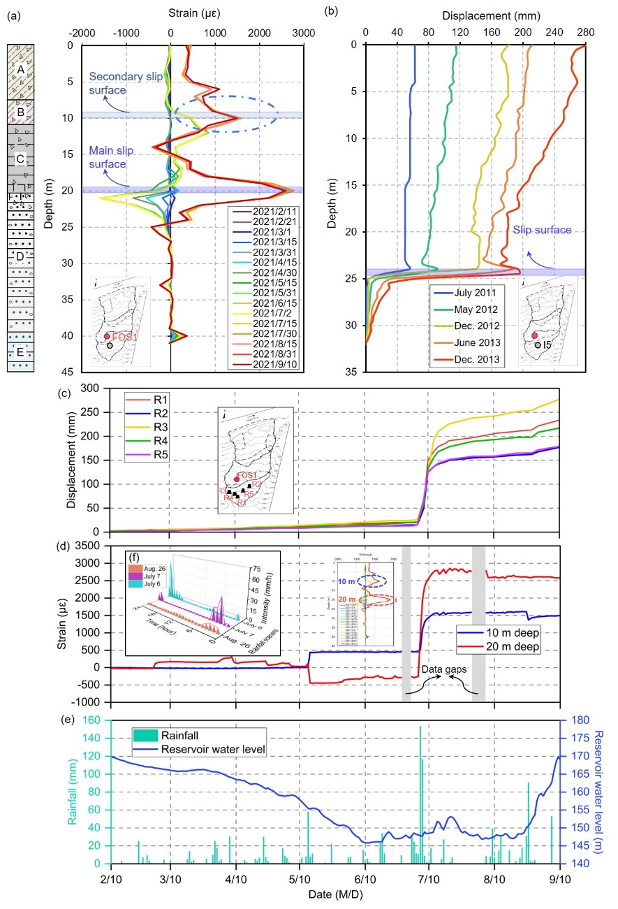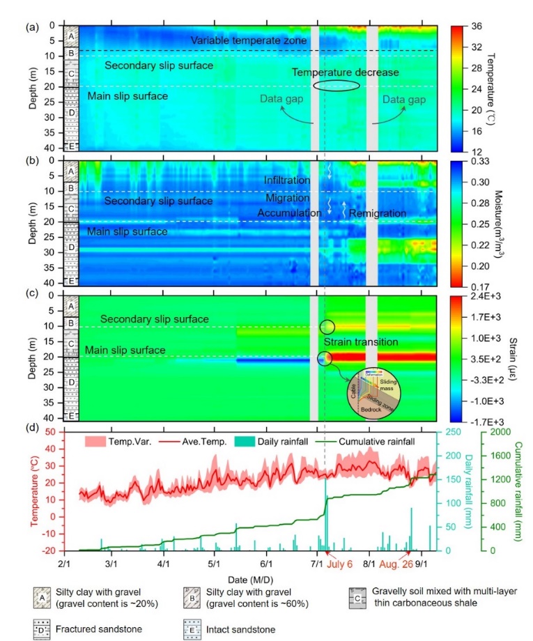 研究团队通过现场长期实时监测,成功捕获了藕塘滑坡地下关键界面及其邻接层的温度、水分和应变信息,重构了高时空分辨率的多物理剖面(图3),在此基础上阐明了滑坡深部的变形演化特征和温度-渗流-变形多元耦合机理,为精准掌握三峡库区特大型滑坡的灾变机制及其驱动因素提供了重要的技术手段和理论支撑。