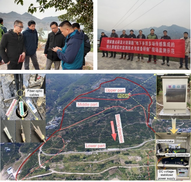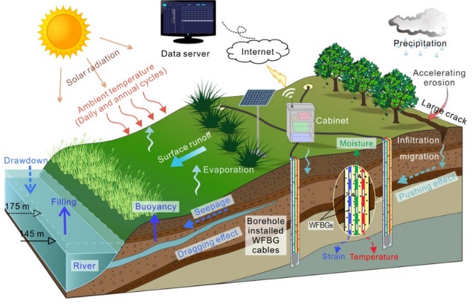 目前,常规的滑坡监测技术在大量程、高时空分辨率和多元表征等方面仍存在诸多挑战,极大地限制了我们对滑坡多物理场相互作用及其演化特征的认识。针对上述问题,pg电子官网朱鸿鹄教授课题组与南大苏州南智传感产学研平台深度合作,选取长江三峡库区藕塘滑坡为研究区,利用弱反射光纤光栅(WFBG)技术,构建了滑坡地下多元信息的光纤神经感测系统,开展了特大型库区滑坡的热-水-力动力学研究(见图1和2)。这项工作是施斌教授团队2018年获得的国家科学技术进步奖一等奖“地质工程分布式光纤监测关键技术及其应用”成果的重要延伸。