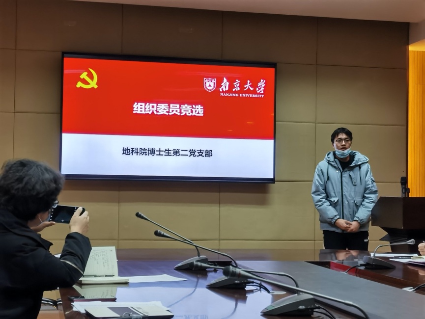 接着,石静同志作为博士生第二党支部向全体支部党员做了述职报告,详细讲述了支部这一年的基本情况变化。首先概括介绍了本支部情况,包括党员、入党积极分子人数的变化、各专业分布情况;梳理并引导大家回顾了党支部这一年组织的各类主题党日学习活动,如助力抗疫的“四个一”活动、建言“第一个南大”的云课堂活动、“学四史”主题微党课活动、一二九朗诵等等。石静同志重点提到,为响应学校提出的党建信息化,本支部已开始使用智慧党建管理服务平台,用于提交党费、管理党员发展等。石静同志对支部之后的发展也作出了规划。