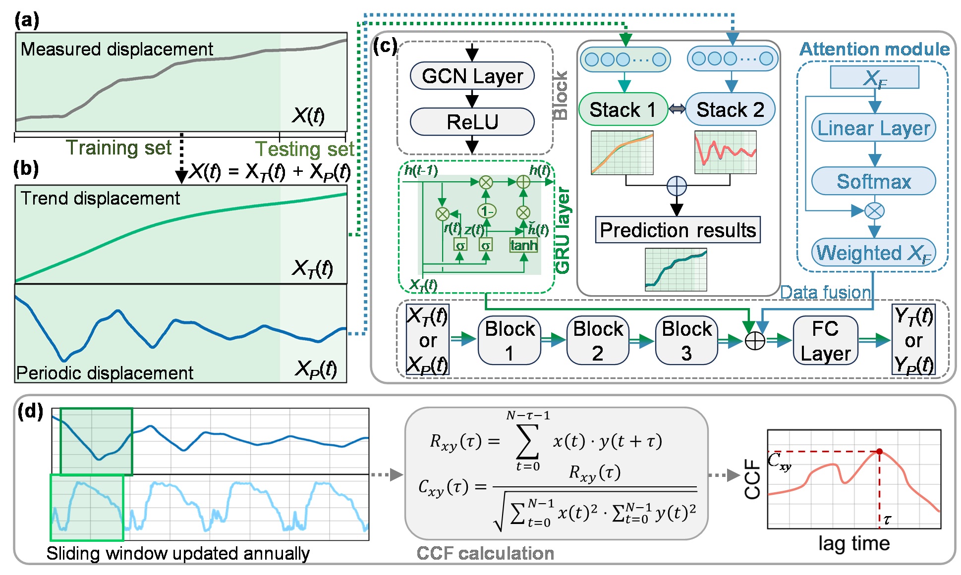 图1 具有可解释特征的时空深度学习模型:(a)测点的位移时间序列;(b) 位移趋势项与周期项时间序列分解;(c)时空图神经网络模型;(d)时滞计算模块