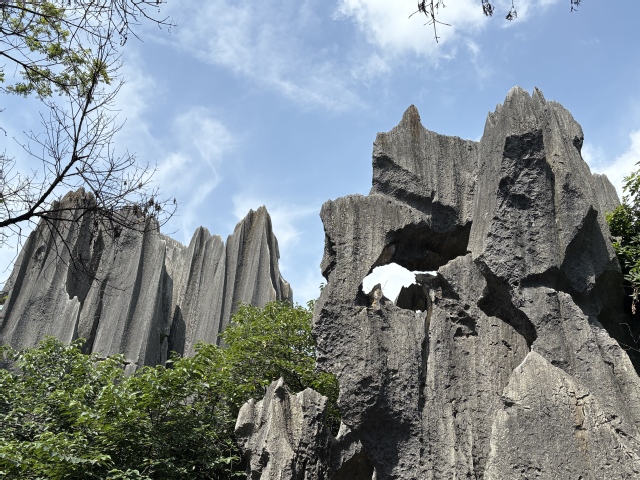 随后实习来到昆明阶段,徐徐凉风一下子吹散了酷暑,也让同学们感受到学院开辟云南地质认识实习新基地的良苦用心。通过在中国前寒武系——寒武系界线层型剖面省级地质自然保护区、澄江化石地世界自然遗产博物馆和世界自然遗产石林风景区等实习点的实践学习,同学们认识到,丰富小壳动物化石开启了寒武纪生命大爆发的生物演化历程,昆明鱼,云南虫等化石的发现为揭示脊椎动物的起源和早期演化提供了关键证据,石林二叠纪灰岩的喀斯特地貌蕴含了地表隆升、地下水溶蚀的重要信息,而石林附近的峨眉山玄武岩是理解大陆风化与地表碳循环的有效载体。