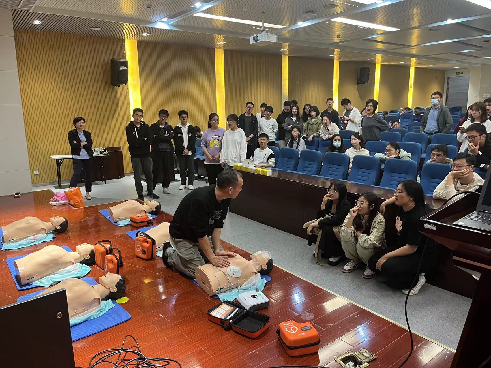 第二部分是《应急安全急救与洗消》,王老师主要是通过自己的急救经验和急救案例,给大家讲解了:应急安全急救、外伤救治、安全洗消等方面的知识。王老师通过仿真人体模型,详细介绍了心肺复苏的步骤和方法,并现场演示了常用CPR急救方法和AED的科学使用流程。之后,师生们轮流上台实操心肺复苏和AED使用。