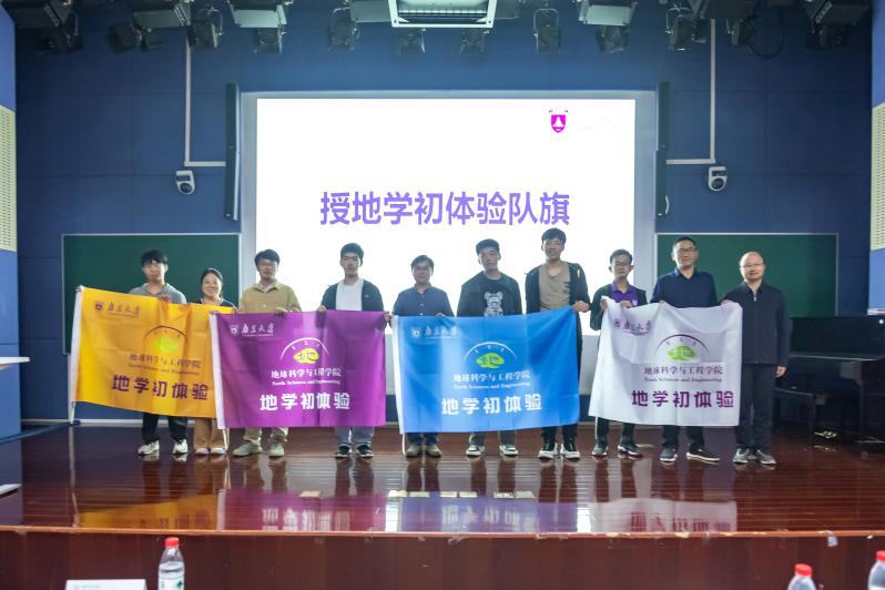 继承地科人出征前的传统,带着地科精神踏上征程。蒋恩铭老师向各路线的带队老师和学生代表授地学初体验队旗。