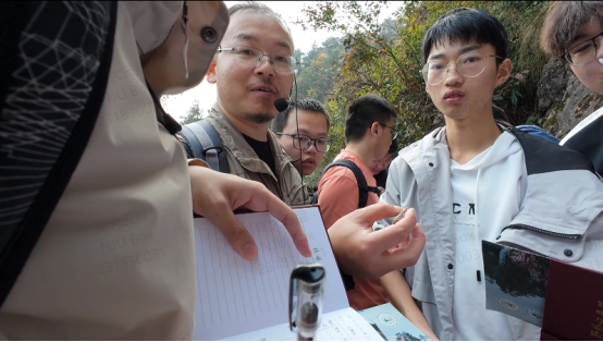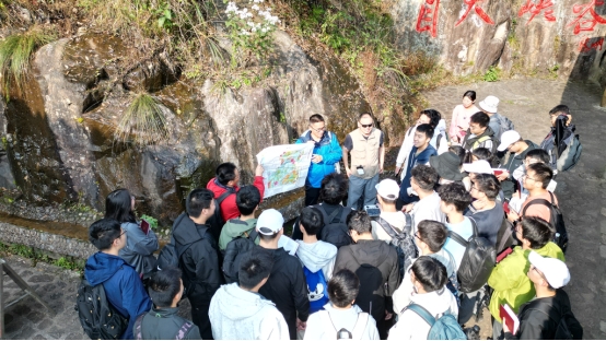 路线四的同学们在曾罡、泮燕红、李石磊三位老师的带领下前往了马仁奇峰。在前往醉山野黄崖瀑布群景区的路上,泮燕红老师指出脚下石板中的生物遗迹化石,为同学们讲解了生物遗迹化石的知识及野外记录本的记录方法,在一处瀑布脚下,曾罡老师指导同学们拾起一块块的花岗岩仔细辨认里面的矿物。接着乘车前往蓬莱仙洞,李石磊老师为同学们介绍了溶洞的形成机制并认真回答了同学们的提问,大家一路走过天洞、中洞、地洞,参观洞内的四大绝景,感受着大自然的鬼斧神工。第二天,同学们启程前往仁奇峰,在山顶的龙马精神雕像下,曾罡老师带领同学们认识了脚下岩石的岩性,并与之前的花岗岩进行了对比。接着走过一段石阶便到了著名景点牛角山面前,结合同学们眼前所见到的景象,曾罡老师再一次向同学们讲解了火成岩的相关知识。伴随着一路上的欢声笑语,这次的地学初体验之旅似乎也走到了尾声。