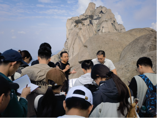 路线三由葛荣峰、连东洋及张霞老师带队,游览了天柱山山谷流泉文化园、天柱山景区和天柱山大峡谷。同学们首先来到山谷流泉文化园,潺潺流水伴千古名家石刻,令人目不暇接,心旷神怡。随后大家前往韩长冲,初步学习接触野外记录簿的书写规范和内容、野外记录照片的要求,他们还遇到一位老先生,笔记本上记满了来此处考察的科研人员的姓名,于是带队老师也将此行留名在册。次日一早,同学们抖擞精神,前往天柱山。同学们欣赏天池峰美景的同时也不忘学习花岗岩的相关知识,天朗气清,同学们或坐或立,拿着野外记录簿求知若渴,别是一番景色。午饭后,前往天柱山大峡谷,感受天柱山的秀丽水景。而后踏上返程。带着不舍,带着疲惫,也带着旅途满满的收获。观赏了自然奇景,学习了地质知识,还有许多同学带上了见到的岩石样品留作纪念,皆可谓是“满载而归”。