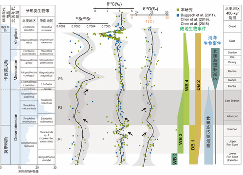 研究团队在华南贵州三条剖面的莫斯科阶上部至格舍尔阶下部共识别出12个牙形类生物带,基于与北美同期生物地层的对比,限定了宾夕法尼亚亚纪中-晚期生物和环境事件发生的时限。同时,同位素记录揭示了生物和环境共演化的三阶段模式:阶段1(莫斯科晚期)δ18O与δ13C同步负漂指示4-6 ℃升温,促使陆地雨林由湿润型科达木-石松组合(WB 2)向半干旱树蕨群落(WB 3)转变;阶段2(卡西莫夫早期)同位素值持续降低,对应Swadelina和Neognathodus灭绝、雨林干旱化及四足动物多样性骤降,构成最严重灭绝阶段;阶段3(卡西莫夫中期)Idiognathodus辐射演化伴随87Sr/86Sr回升,反映风化作用增强促进海洋生产力恢复。另外,莫斯科阶-卡西莫夫阶界线(MKB)的传统标志种 Swadelina subexcelsa 首现层位(FAD)与δ13C值负漂移对应,而替代标志种 Idiognathodus heckeli 的首现则伴随87Sr/86Sr值显著正偏移,为全球卡西莫夫阶底界的识别提供了化学地层学辅助证据。值得注意的是,研究揭示的升温驱动干旱化路径与当前全球变暖背景下热带雨林的脆弱性具有相似性,可为预测未来生物-气候响应机制和过程提供类比。