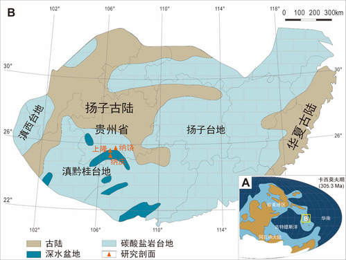 图1 纳庆、纳饶及上隆剖面的地理位置与古地理背景