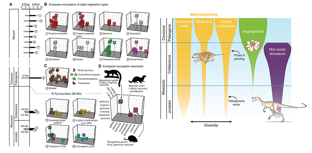 作为人类祖先的早期哺乳动物,与恐龙生活在约两亿三千万年至六千六百万年前。近年来通过对保存完好中生代哺乳动物的研究,古生物学家对早期哺乳动物的个体演化取得了很多新认识,但对早期哺乳动物的群落演化还知之甚少。在2019年4月29日《美国科学院院报》发表的一篇论文中,一个由中国和美国组成的科研团队首次揭露的中生代哺乳动物群落的生态结构,通过与现生的小个体哺乳动物群落比对,提出了驱动哺乳动物群落演化的三个重要因素。