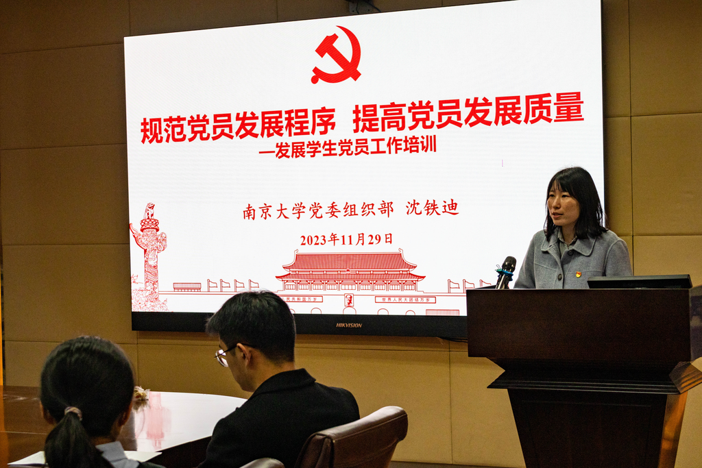 校党委组织部沈铁迪老师以“规范党员发展程序,提高党员发展质量”为主题详细介绍了党员发展的五个阶段,强调了发展流程中的规范和注意事项,重点讲解了入党申请书、思想汇报等入党材料的撰写要点,并结合实际案例对材料填写、归档的常见问题进行说明。此外,她对党支部发展学生党员工作的每个阶段所需开展的活动进行了详细梳理,并提醒各党支部在吸收先进分子入党时,要仔细把关入党材料质量,坚持“成熟一个,发展一个”的个别吸收原则,并严格按照学校党委组织部和学院党委要求做好党员发展工作。