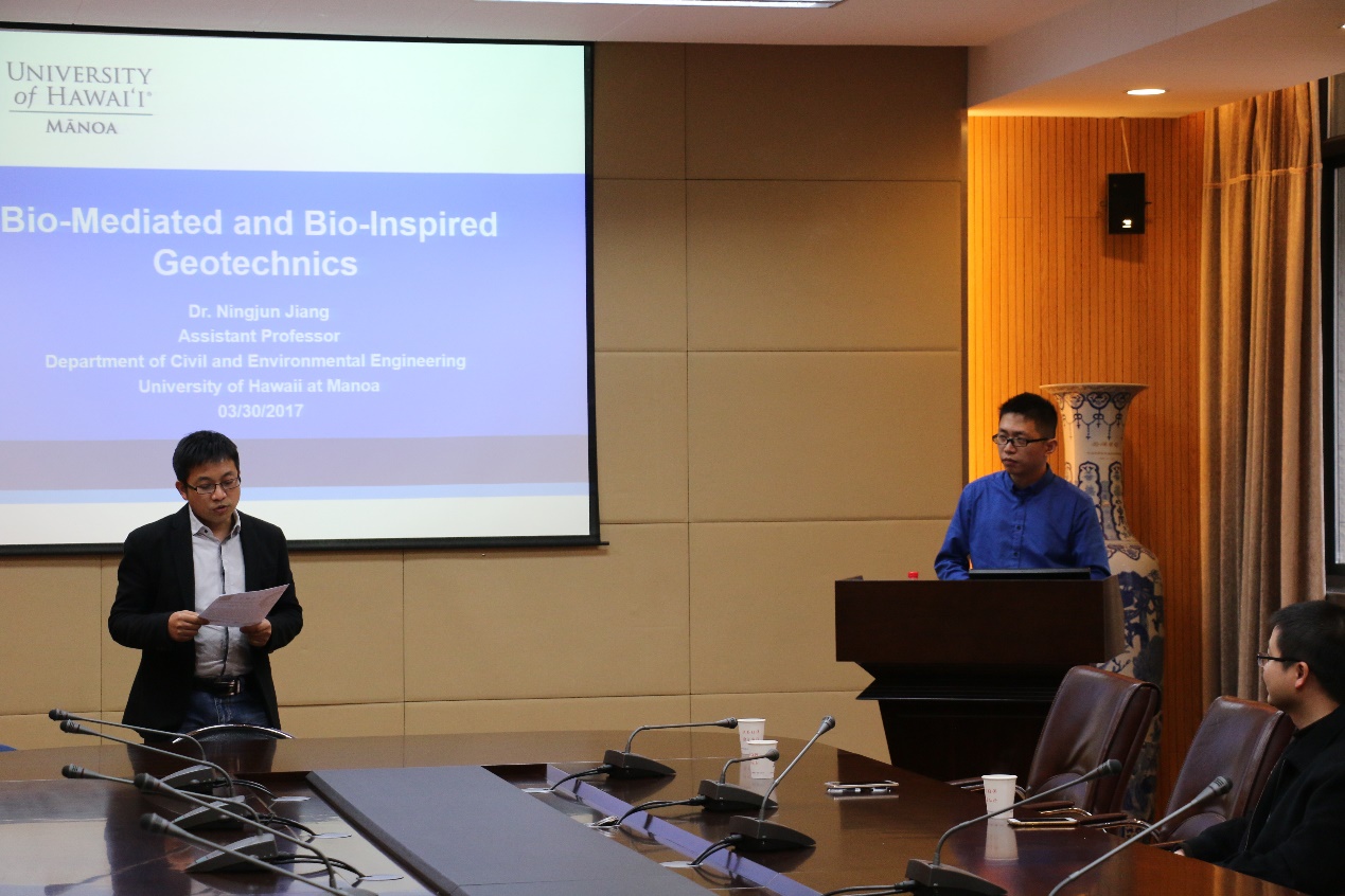 2017年3月30日,应pg电子官网唐朝生教授邀请,美国夏威夷大学土木工程系蒋宁俊博士来pg电子官网进行学术交流访问,并为pg电子官网师生作了题为“Bio-mediated and Bio-inspired Geotechnics”的学术报告。