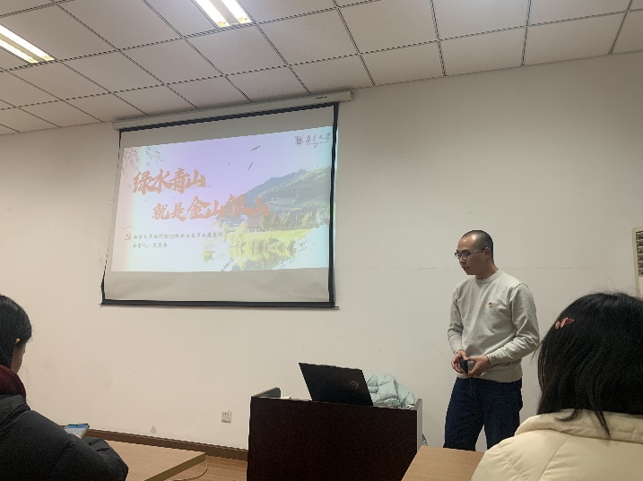 随后开始领学环节,2023级硕士二支部艾志伟同志以“绿水青山就是金山银山”为主题进行了分享。他介绍了两山理念的提出及其辩证关系,深刻地阐述了两山理念的的作用和意义,介绍了“三段论”观点:第一,在目标层面上必须坚持“既要绿水青山,也要金山银山”,不可偏废;第二,随着生态文明建设的推进和认识水平的提高,需要敢于践行“宁要绿水青山不要金山银山”的理念;第三,基于一种全新的经济制度框架和公民价值理论,将能够做到把绿水青山本身视为金山银山。