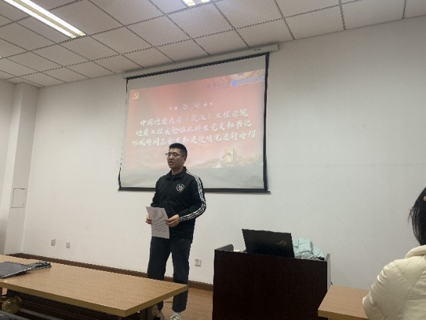 陈婷婷从支部概况、支委构成、支部品牌活动等方面介绍了2023级硕士二支部的建设情况,中国地质大学(武汉)工程学院地质工程实验班本科生支部书记张佩琦从“做好常态化教育培养,确保以思想凝魂”“强化组织建设,确保以制度筑骨”“矢志专业报国,提升服务本领,确保以实践增肌”三方面对支部进行了介绍。