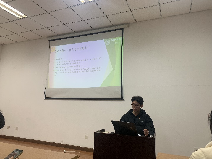 随后,地质工程实验班本科生党支部陈城同志就“坚持绿色发展理念,携手共建美丽中国”进行了主题党课分享。陈城同志首先分析了GDP的变化与环境之间的关系,介绍了环境税“双重红利“假说。之后概括了绿色发展理念的基本内涵,包括“师法自然、和谐共生” 的生态效用观;“系统整合、多规合一” 的生态制度观;“科技向善、创新技术” 的生态革新观;“集约节约、精简质朴” 的生态消费观;“崇品尚德、求真至善” 的生态人格观。他着重阐述了我国的绿色发展实践,并呼吁同为学习地质专业的大家,一起运用自己所学的知识去践行绿色发展理念。
