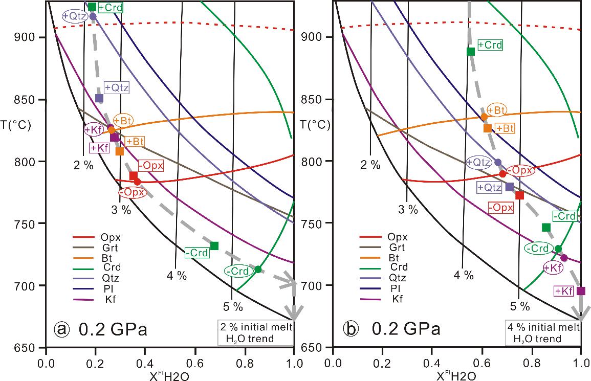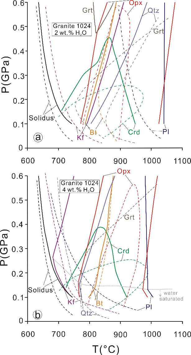 通常认为,花岗岩中某些特征矿物可以指示其结晶时水含量信息,比如角闪石的出现表明熔体结晶于相对富水的条件下(即熔体水含量大于4 wt.%),而斜方辉石的出现则指示相对高温贫水的结晶条件(即温度大于800°C,熔体水含量小于3 wt.%)。流体和熔体包裹体的研究可以制约岩浆结晶时的水含量以及流体的种类,但是原始流体和熔体成分往往很难保存下来。岩浆结晶实验为岩浆水含量、结晶温度及压力提供了较为精确的制约,但是实验过程往往较为费时且国际上仅有为数不多的实验室开展岩浆结晶实验。而结晶热力学模拟可为探究岩浆结晶温度、压力以及水含量条件提供方便快捷的途径。目前使用较为广泛的热力学模拟软件是rhyolite-MELTS。该软件主要针对结晶度小于50%的准铝质火山岩,且对于镁铁矿物(黑云母,辉石和铁钛氧化物等)结晶条件的制约存在较大误差。因此,对于广泛分布的花岗岩,寻找一种估算其结晶温度、压力及水含量的手段是当前研究中的迫切需求。