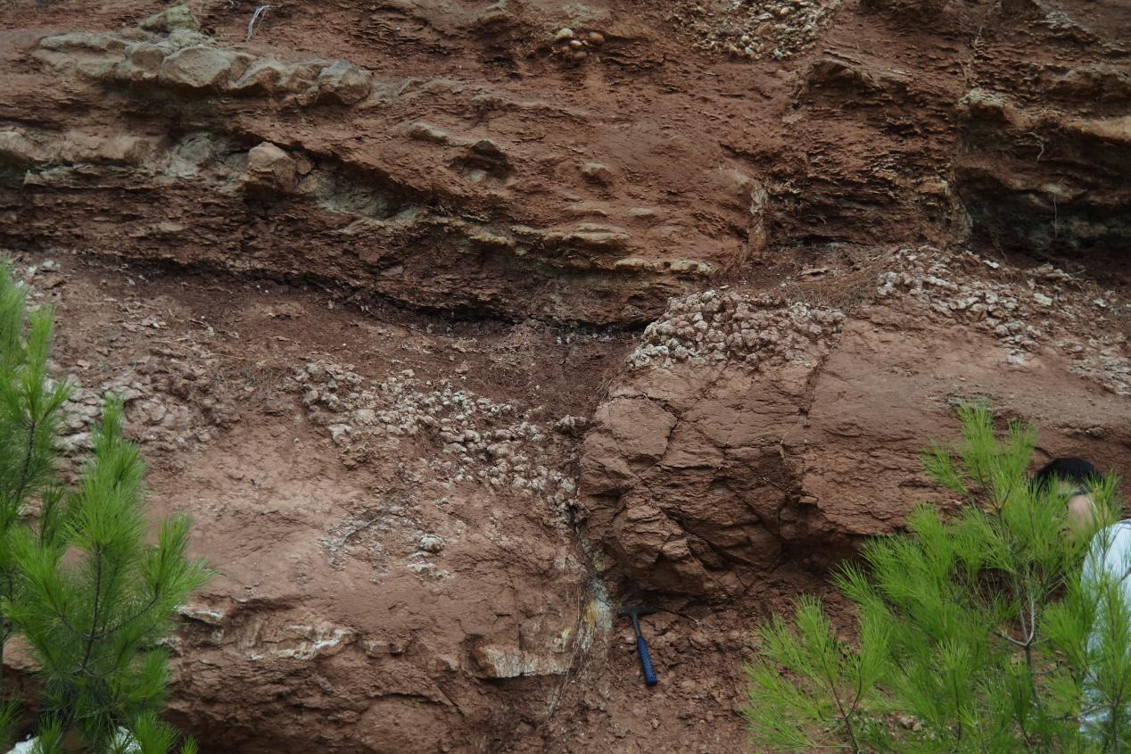 我们一路继续前行,一套红层夹砾岩的出现让同学们更加振奋。红层因富含三价铁(Fe³⁺)而呈现红色,表明其形成于地表氧化环境——这进一步证实了地壳抬升的存在!