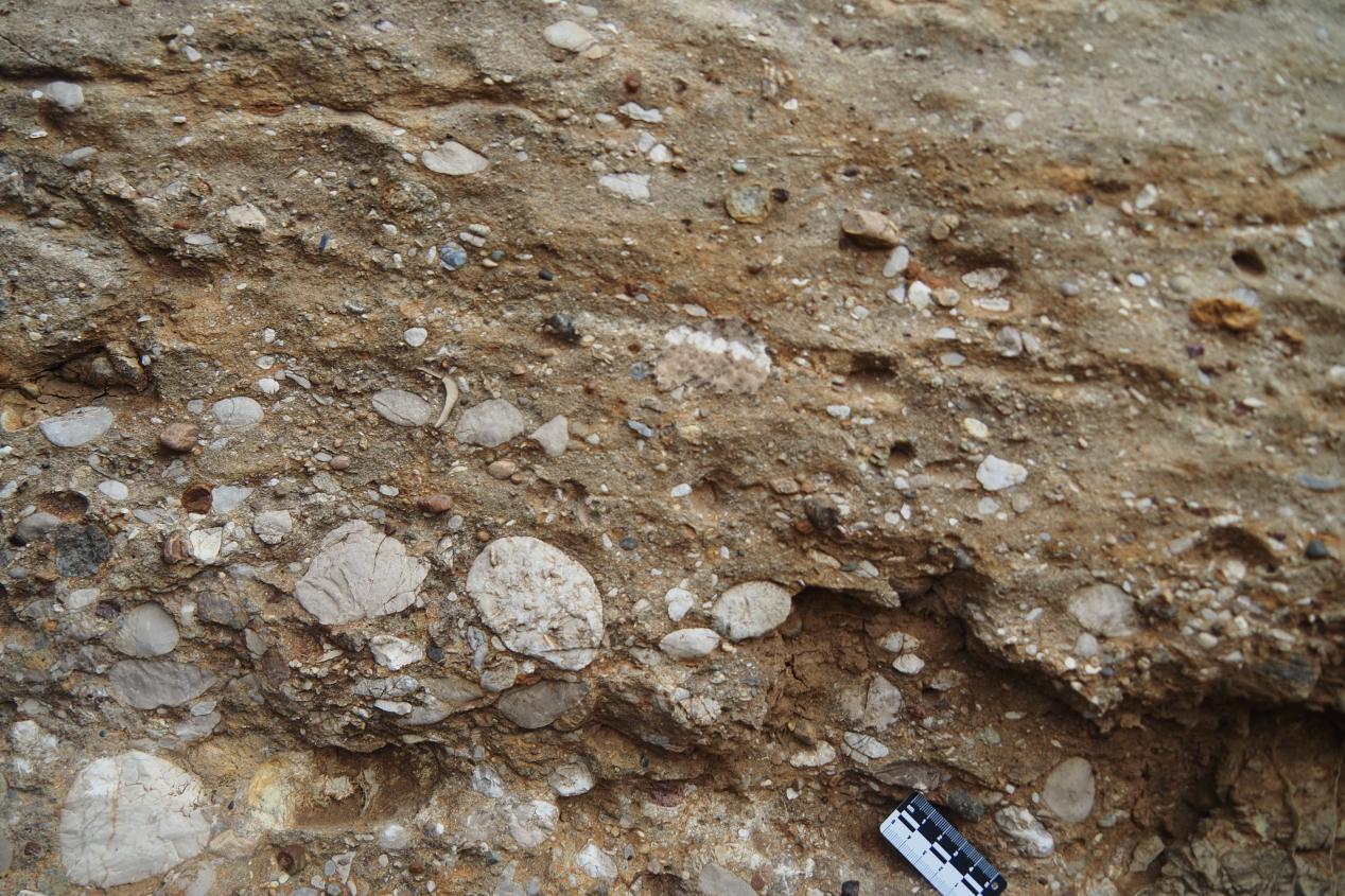 底砾岩:地壳抬升会将地表以下的岩石带到地表,往往使得地层发生倾斜,较老的地层暴露在地表,经风化剥蚀后的碎屑物被搬运堆积到低洼处,经沉积固结后形成底砾岩。这些砾石如同“地质指纹”,记录了地壳抬升-风化剥蚀-沉积固结等一系列构造活动的历史。