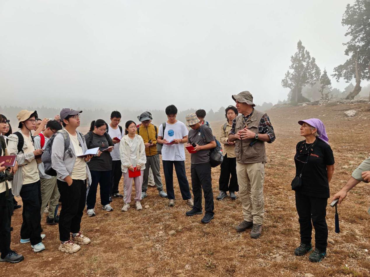 随着汽车驶入蜿蜒的山路,路旁裸露的岩石逐渐从土黄色变为灰白色,岩性也从碎屑岩过渡为碳酸盐岩。穿过薄雾,我们在一片荒草地前停下。Osman教授指向眼前高耸的岩壁:“这是一套碳酸盐台地沉积物。”
