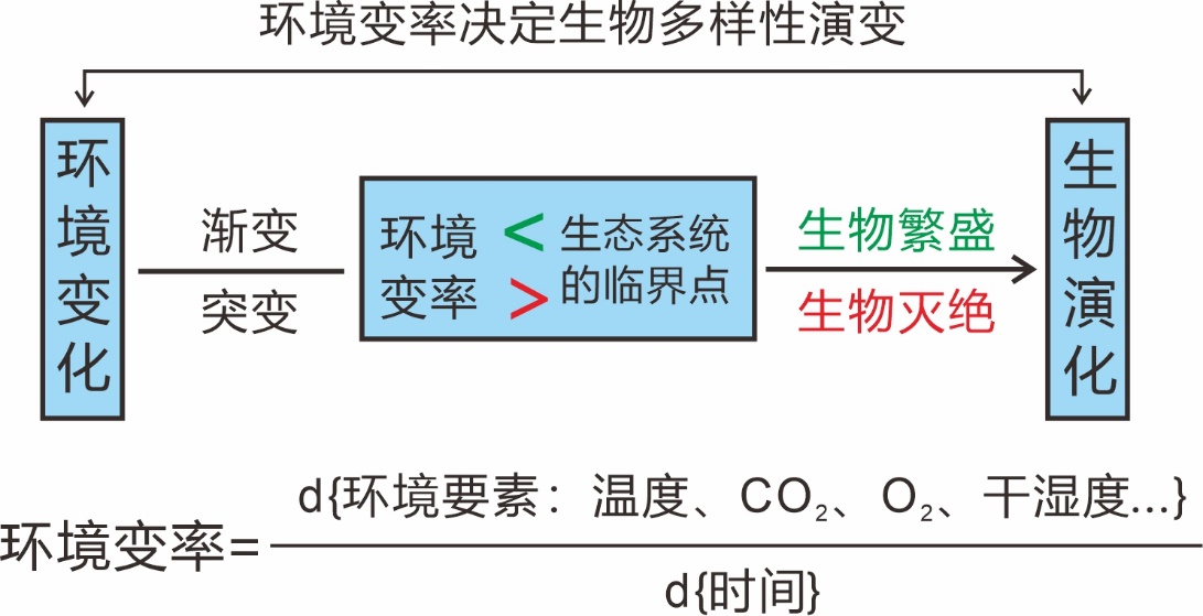 文章通过对5亿多年以来地球发生的各种重大生物与气候事件的环境背景、过程及其原因进行了深入地分析,其结果表明地球在过去5亿多年中大部分时间处于两极无冰的温室效应阶段,长时间稳定大冰期往往导致生物辐射,长期稳定的温室效应期并不导致生物大灭绝。中生代极度繁盛的恐龙时代其海水表面平均温度就比当今地球可能高了10℃以上,导致地球生态系统发生灾变的最根本驱动因素是地球环境因子(包括温度、CO2、海洋酸碱度、降雨量等)变化的速率,而不是简单的环境背景值高或低,当环境因子变化速度超出生态系统的承受力时,生态系统来不及适应环境而崩溃,从而发生生物大灭绝;当环境因子变化速度较慢时,生态系统有足够的时间来适应环境变化而得以繁盛(图2)。