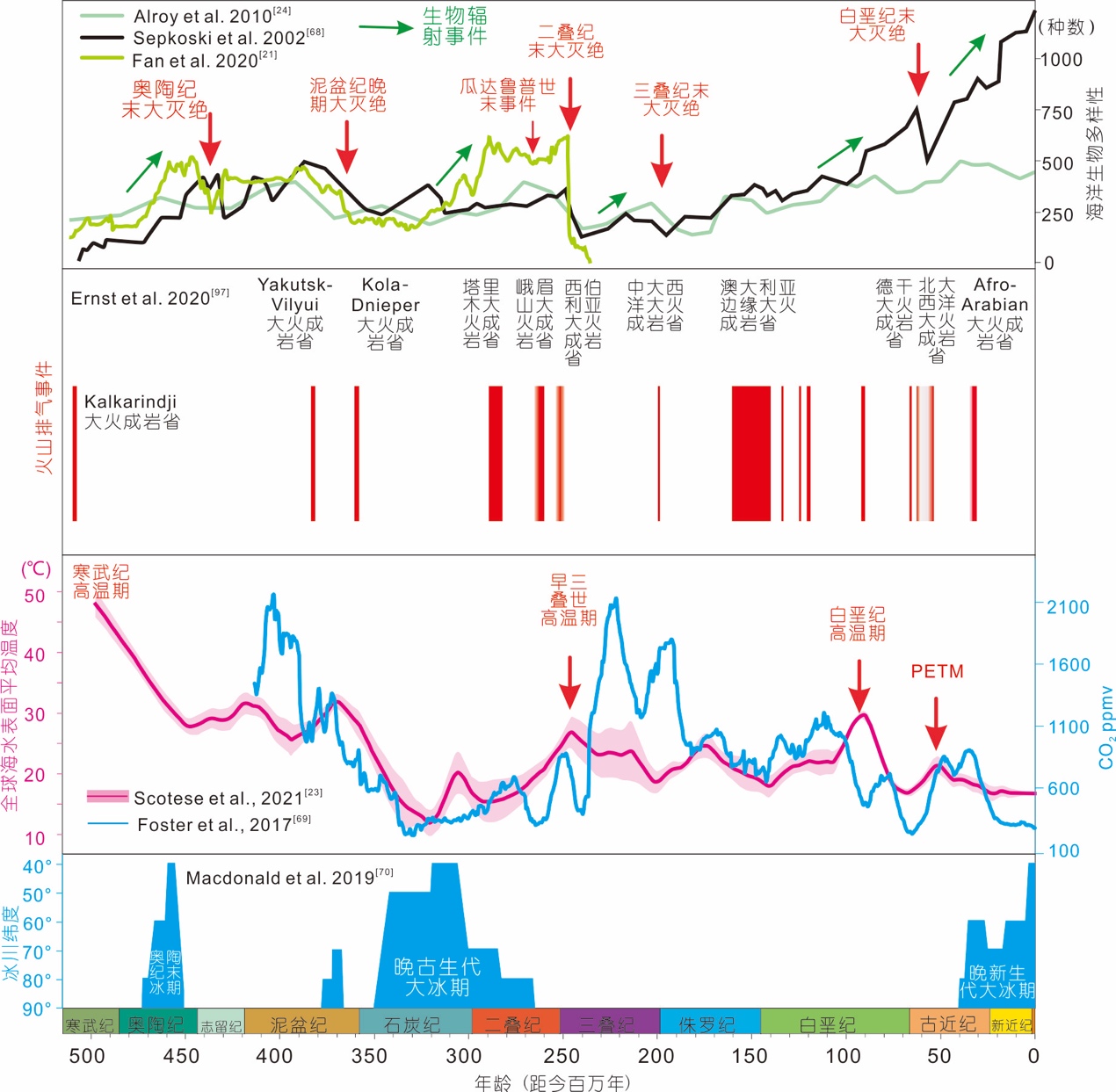 图1. 5.4亿年以来生物多样性、火山事件、大气CO2浓度、古海水平均温度变化、主要极端气候事件和与冰川覆盖范围变化.