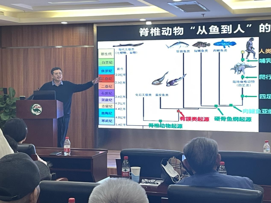 论坛结束后,在古脊椎所校友朱敏(小,与院士同名)的带领下,校友们参观了中国古动物馆。他用生动的语言,让母校领导和北京校友从实物化石的角度,让校友们在听报告的基础上,又在视觉上直观地认识到了脊椎动物从鱼类(海口鱼)演化到人类的复杂演化历程。