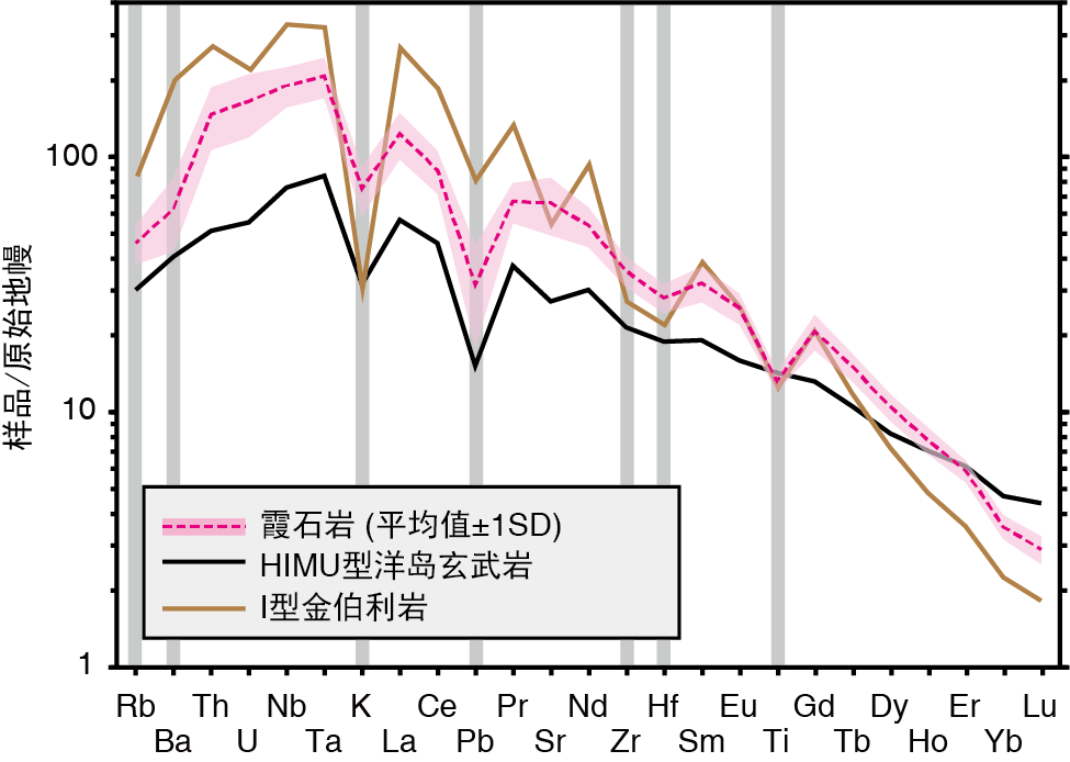 在中国东部广泛分布的新生代火山岩中,岩石类型丰富。其中的霞石岩与金伯利岩呈现出极其相似的微量元素特征(图1),如在微量元素蛛网图上表现为K、Pb、Zr、Hf、Ti的负异常的特征(Zeng et al., 2010; Giuliani et al., 2020),暗示两类岩石在成因上可能存在一定的相似性。那么这些中国东部的新生代霞石岩是否也代表直接来自地幔过渡带的岩浆呢?为此,该小组选择位于山东的四座新生代霞石质火山开展了以Mg稳定同位素结合放射成因同位素(Sr、Nd、Hf、Pb)以及元素比值为主要示踪手段,探讨霞石岩岩浆深部地幔来源的可能性。