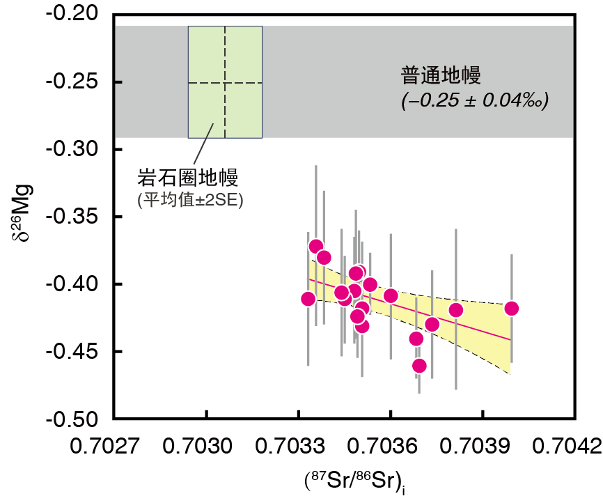 此外,该研究小组发现观察到这些山东霞石岩在26Mg-87Sr/86Sr(图3)、143Nd/144Nd-MgO以及26Mg-Ba/Th等相关图上表现出良好的线性相关,暗示其经历过两端元的岩浆混合作用。其中高MgO端元具有亏损地幔的同位素组成,而低MgO端元保留了更多的含碳酸盐沉积物的同位素特征。因此,需要两阶段模型来解释霞石岩的成因(图2)。首先,含碳酸盐的沉积物在地幔过渡带深度发生低程度的部分熔融,形成碳酸盐化的硅酸盐熔体(初始熔体)。随后,此初始熔体在上升过程中与周围的橄榄岩发生反应,初始熔体转变为反应熔体。反应熔体与后续上升的初始熔体之间的混合,最终形成了霞石岩。对全球不同构造背景的霞石岩和碧玄岩的地球化学特征汇总表明,大多数这类碱性岩石都具有异常低的K/U和Ba/Th比值,说明这类深部来源的岩浆在全球范围内可能是普遍存在的。