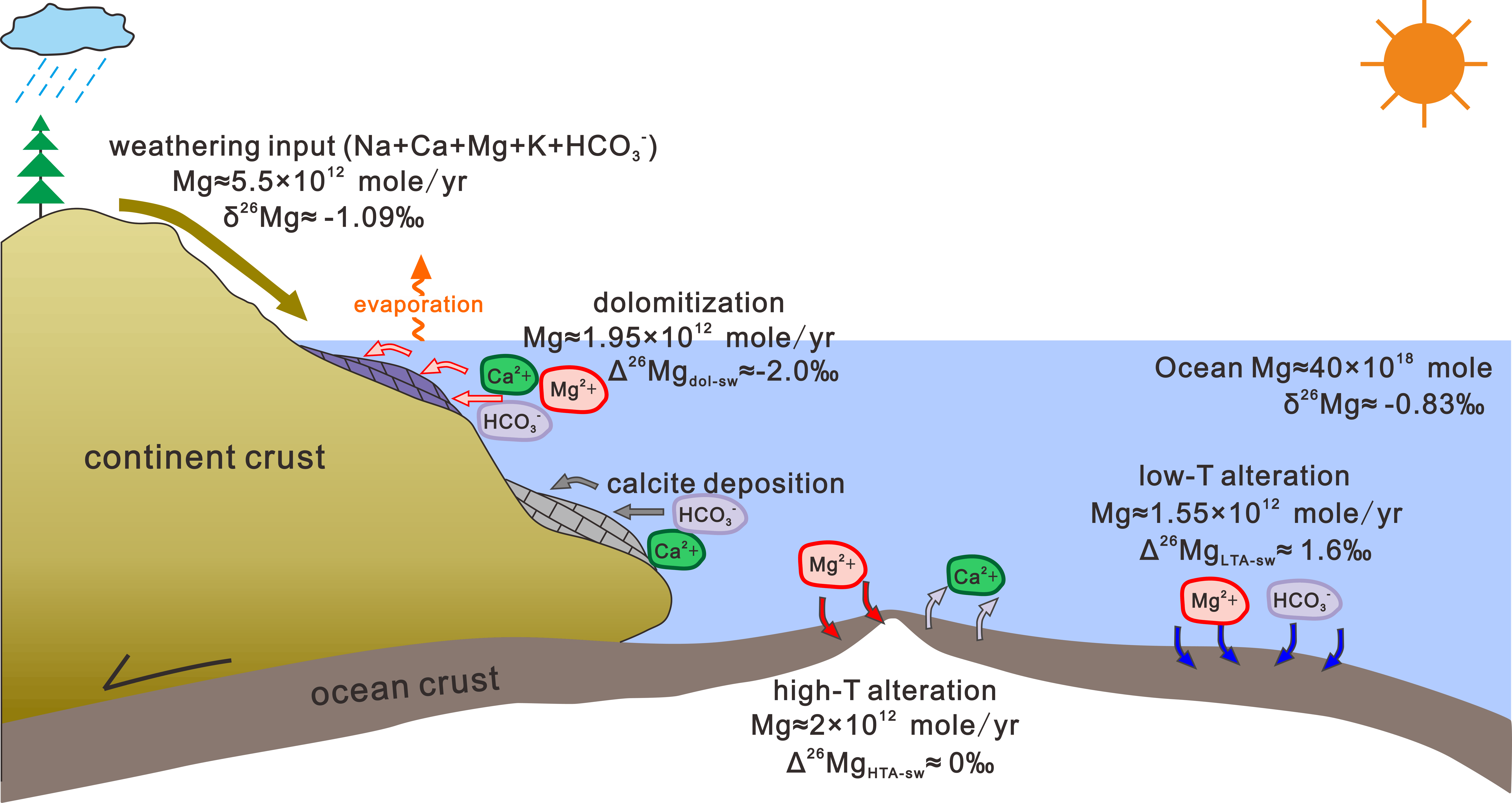 图1. 海洋镁循环过程及同位素平衡示意图