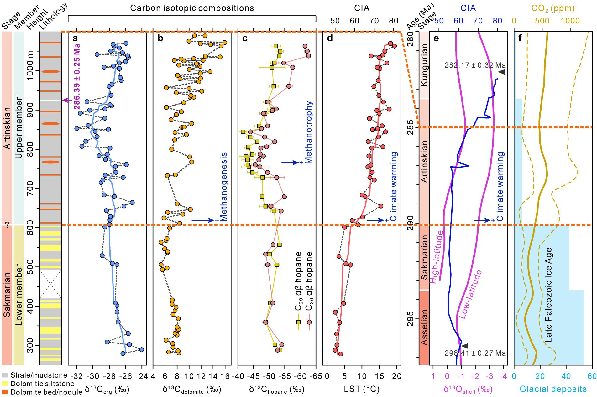 (2)揭示了芦草沟组记录的湖泊CH4动态循环,不断增加的CH4排放有助于晚古生代大冰期的结束和气候变暖。自生白云石和细菌来源藿烷生物标志物的碳同位素组成揭示了微生物CH4动态循环:富13C的自生白云石(δ13C > +10‰)表明缺氧湖泊沉积物中强烈的CH4生成;贫13C的藿烷(δ13C值低至-63‰)指示上覆水柱中活跃的好氧CH4氧化(图2)。CH4循环的加剧与早二叠世亚丁斯克期气候变暖同步发展,持续了至少3~5个百万年。此时全球冰川沉积数量下降6倍,标志着晚古生代冰期的结束。大量的温室气体CH4从古准噶尔湖排放到大气中,初步计算通量为6.4 Tg CH4 yr-1(占当今湖泊年排放总量的5~28%)。湖泊CH4排放可能是全球碳循环扰动的重要驱动机制,并为气候变暖提供正反馈,推动了一个长期冰室向温室气候的转变。这一认识有助于深化理解地球显生宙历史上最显著、最神秘的气候转变,明确湖泊CH4排放在气候变化中的重要作用,特别是在当今全球不断变暖、冰川加速消融的背景下,除了CO2,需要进一步重视CH4在不同时间尺度的增温效应,这是全球变化研究的重要科学问题。
