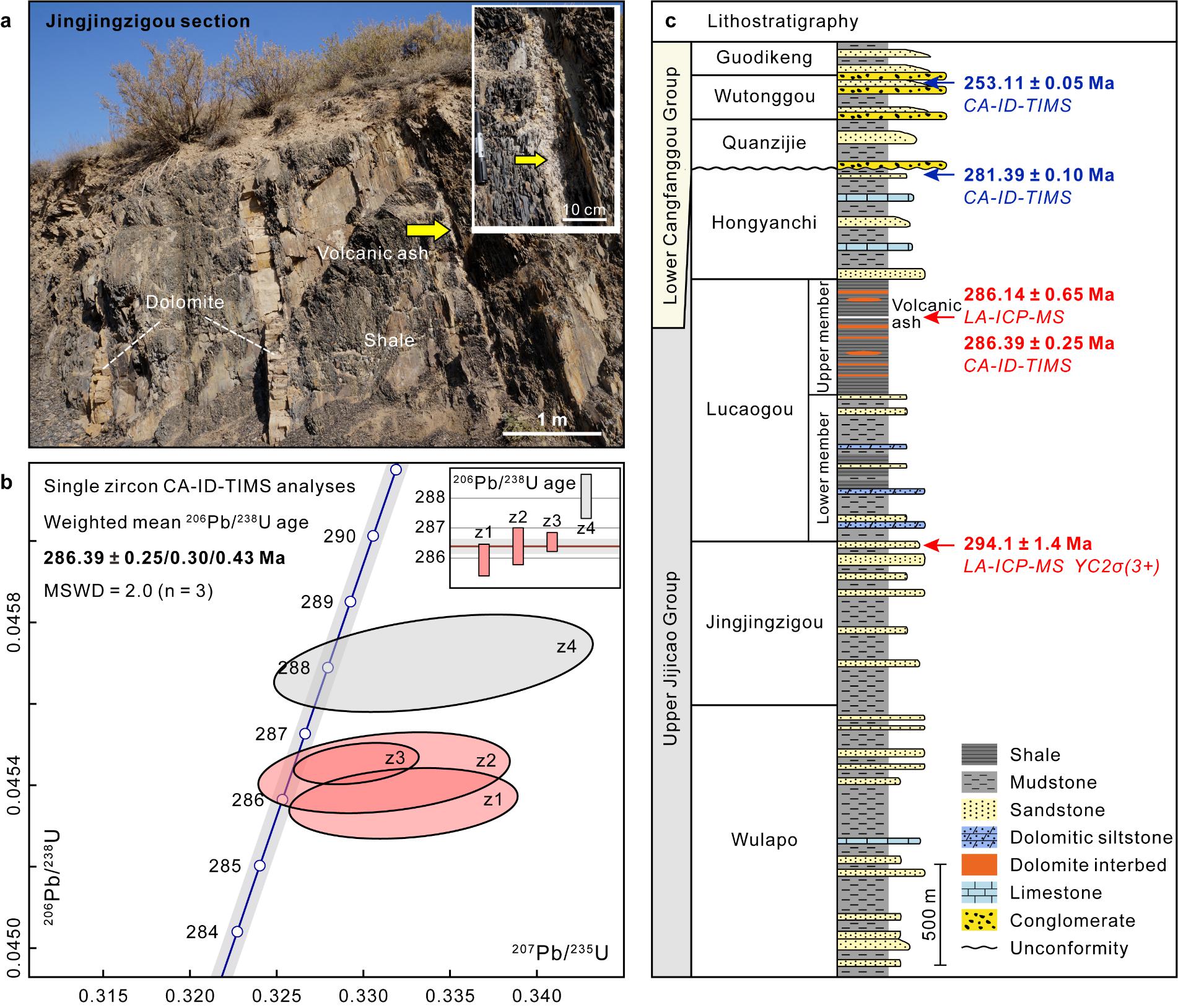 (1)获得了芦草沟组首个高精度CA-ID-TIMS火山灰锆石年龄,明确了其为早二叠世沉积,修正了长期以来认为是中二叠世的传统认识。芦草沟组是准噶尔盆地所处北疆地区的一套重要烃源岩,也是关键的页岩油、油页岩资源勘探开发层位,具有重要的经济价值。长期以来该层位缺乏绝对年代约束,其时代归属存在争议。本次研究在芦草沟组上部发现了一层厚约4 cm的火山灰,锆石U-Pb CA-ID-TIMS年龄为286.39 ± 0.25/0.30/0.43 Ma;下伏井井子沟组近顶部的凝灰质粉砂岩的最大沉积年龄为294.1 ± 1.4 Ma(图1),共同限定芦草沟组沉积于早二叠世萨克马尔期(Sakmarian)-亚丁斯克期(Artinskian)。该年龄数据确立了新的年代地层格架,对准噶尔盆地地层对比、构造演化和石油地质研究具有重要的时限意义。