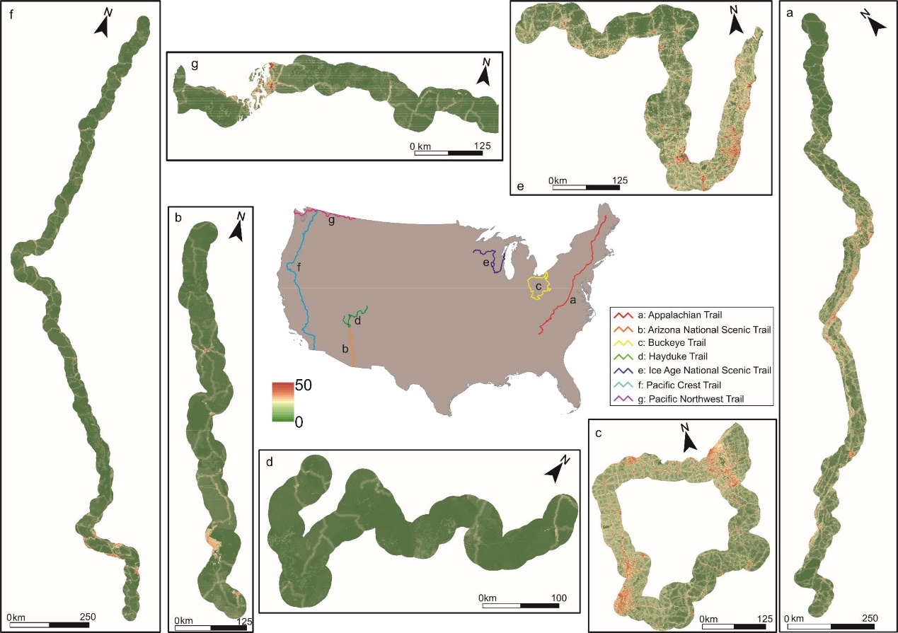Using glimmer data from SDGSAT-1, the study focused on seven long-distance trails in the United States. The researchers proposed a high-timeliness method for quantifying human populations and developed an Enhanced Human Footprint Index (E-HFI) map to measure the impact of human activities on wilderness areas. This study offers a new perspective on assessing human activity impacts across various ecosystems and regions, providing valuable insights for the conservation and sustainable development of wilderness along long-distance trails.