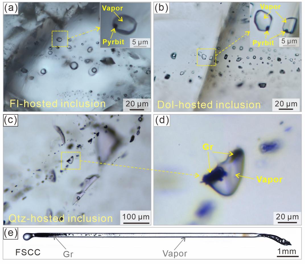 Fig. 1. Natural inclusions containing carbonaceous materials and methane in fluorite (Fl), dolomite (Dol), and quartz (Qtz), and fused silica capillary capsules (FSCC) loaded with gas and carbonaceous materials. Pyrbit = pyrobitumen, Gr = graphite.
