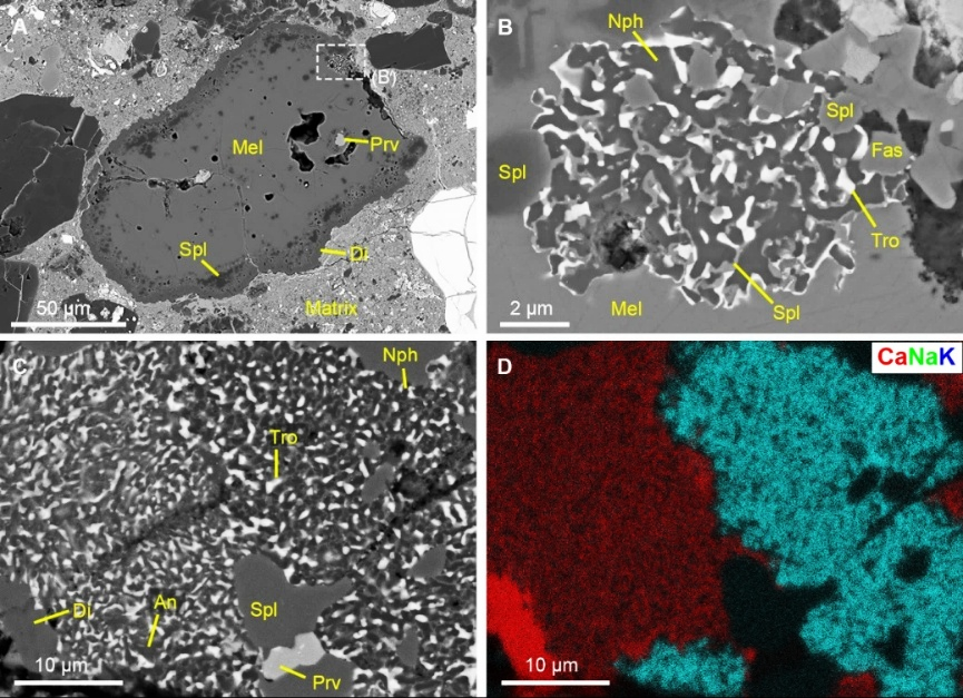 Recently, Shu-Zhou Wang, a PhD student from Nanjing University, and his coauthors studied a series of CO (Ornans-like) carbonaceous chondrites. He found many fine-grained sulfide + silicate/oxide intergrowths in these meteorites (Figure 2) and proposed a new formation mechanism: replacement of melilite and olivine by sulfur-rich vapors. They also found a correlation between the occurrence/abundance of these sulfide-rich intergrowths and the petrologic types of these meteorites, with samples of high petrologic types (3.5-3.6) containing abundant fine-grained intergrowths but no relict melilite. They first tried to interpret the correlation with typical asteroid processes, such as thermal metamorphism, aqueous alteration, or impacts. However, no such processes can account for all of the observed features. Through considering sulfide-rich intergrowths in different meteorites, they propose that the partially differentiated planetesimal hypothesis can perfectly explain these phenomena. They suggest that during the core crystallization in a partially differentiated planetesimal sulfur would get enriched and degas. The ascending sulfur vapor will react with silicates in overlying rocks (Figure 2). This process not only explains the sulfur-depletion geochemical features in many iron meteorites but also accounts for the sulfide-silicate intergrowths observed in differentiated meteorites. This hypothesis has twofold implications. First, the intergrowths represent the first petrologic evidence for the partially differentiated planetesimal hypothesis. Second, sulfur degassing from partially differentiated planetesimal cores may be a common phenomenon.