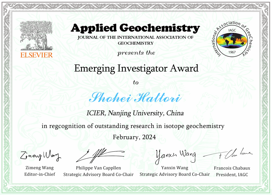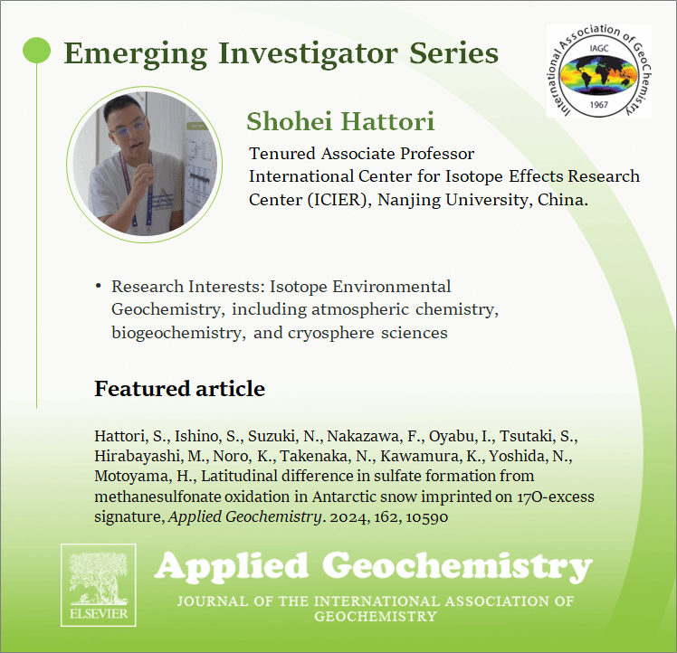 In Feb 2024, Shohei Hattori at International Center for Isotope Effects Research (ICIER), School of Earth Science and Engineering, NJU was awarded Emerging Investigator Award by International Association of GeoChemistry (IAGC). His original research paper, titled “Latitudinal Difference in Sulfate Formation from Methanosulfonate Oxidation in Antarctic Snow Imprinted on 17O-excess Signature,” is featured in the Emerging Investigator Award, and has been selected as the Editor’s Choice of IAGC journal Applied Geochemistry.