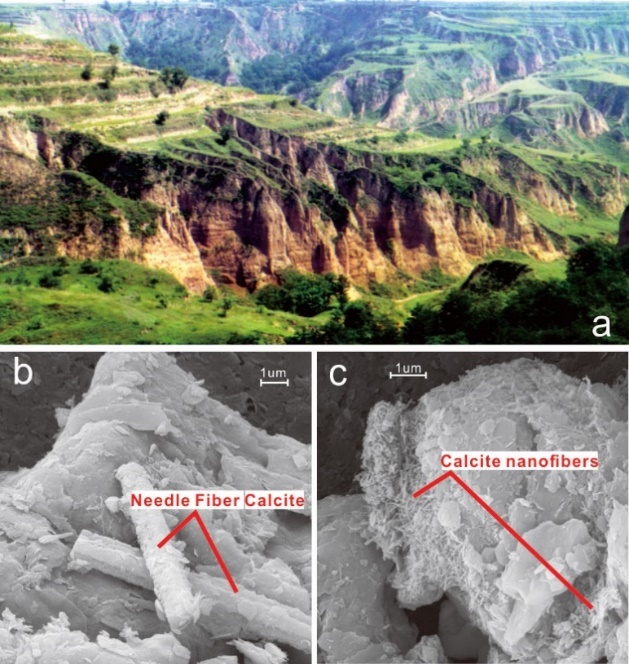 Figure 1. Pictures of Luochuan loess-paleosol profile and pedogenic carbonates: (a) The Pleistocene eolian deposit shows the loess-paleosol cycles with alternating dark and light colors; (b)-(c) The micromorphologies of pedogenic carbonates under the scanning electronic microscope
