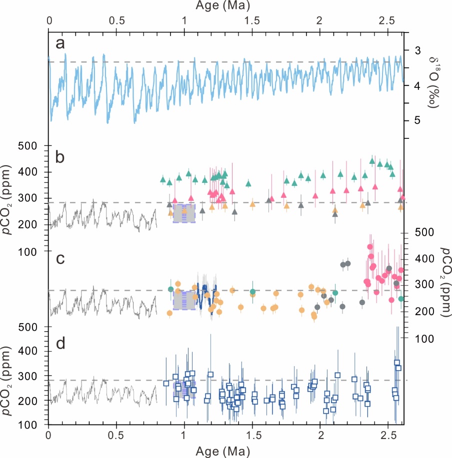 Figure 2. Comparison between early Pleistocene atmospheric CO2 levels reconstructed from different indicators and deep sea δ18O records (reflect changes in ice volume): (a) δ18O records of deep sea sediment; (b) Atmospheric CO2 estimates based on alkenones from coccolith metabolites; c) Atmospheric CO2 estimates based on the δ11B of the foraminifer shells; (d) CO2 results from this study based on pedogenic carbonates of the Luochuan paleosols. The gray curve is the atmospheric CO2 concentration recorded by the Antarctic ice core over the past 800,000 years; the purple box is the atmospheric CO2 levels ~1 million years ago recorded by the Antarctic blue ice; the horizontal dashed lines represent preindustrial condition.