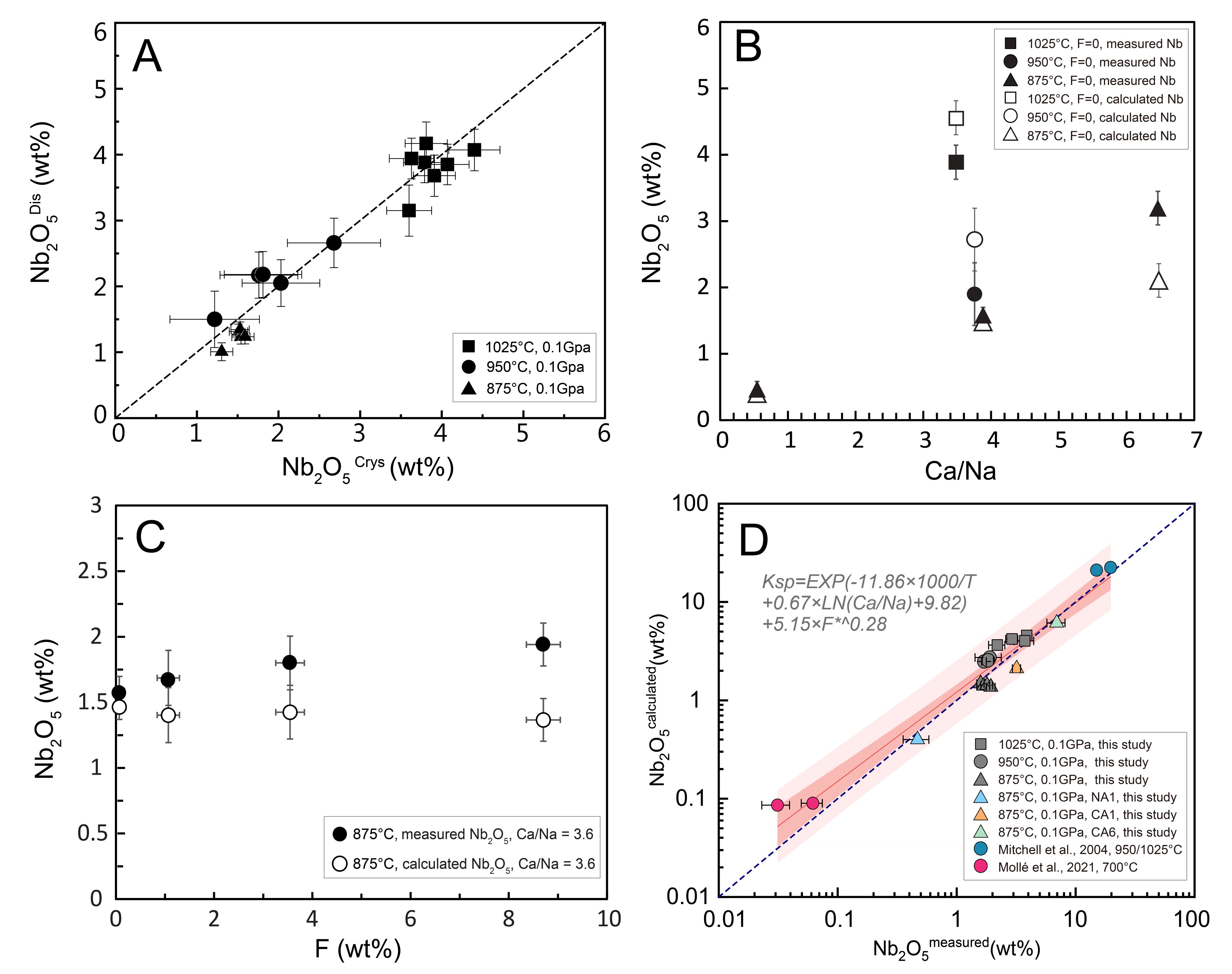 Experimental results show that Nb solubility in carbonatite melts decreases sharply with decreasing temperature and increasing Na content. During magmatic differentiation, the solubility of Nb (expressed as Nb2O5) can drop dramatically from several wt.% to below 0.03 wt.% (Fig. 2). Quantitative modeling indicates that this drastic decrease can trigger large-scale pyrochlore crystallization within a narrow temperature interval of approximately 700–750 °C (Fig. 3). This process represents a critical mechanism for the formation of Nb mineralization during the differentiation and crystallization of carbonatite magmas (Fig. 4).