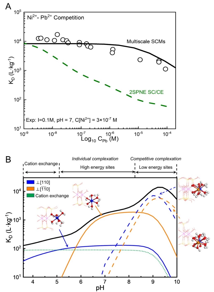 Researchers from the Computational Mineralogy Group at School of Earth Sciences and Engineering, Nanjing University, have developed a multiscale theoretical model to simulate competitive metal adsorption on clay mineral surfaces (Fig. 1).Grounded in First-Principles Molecular Dynamics (FPMD) calculations, the model integrates crystal structure and interfacial reactivity within a bottom-up framework, enabling precise determination of the geometric parameters and acidity of surface sites, as well as elucidation of metal uptake mechanisms, including isomorphic substitution, interlayer cation exchange, and competitive adsorption on edge surfaces (Fig. 2).The model successfully reproduces experimental data for multi-metal competitive adsorption systems (Fig. 3), demonstrating significantly enhanced predictive accuracy compared to the widely used two-site non-electrostatic surface complexation/cation exchange model (2SPNE SC/CE) developed at the Paul Scherrer Institute in Switzerland (Fig. 3A).Furthermore, the model captures the transitions among three adsorption mechanisms—cation exchange, independent adsorption, and competitive adsorption—under varying pH conditions (Fig. 3B), providing a quantitative description of metal partitioning on clay mineral surfaces.The model establishes a new theoretical framework for multiscale studies of elemental geochemical cycling and environmental behavior, offering significant potential for applications in metal mineralization, soil remediation, and nuclear waste repository safety assessment.