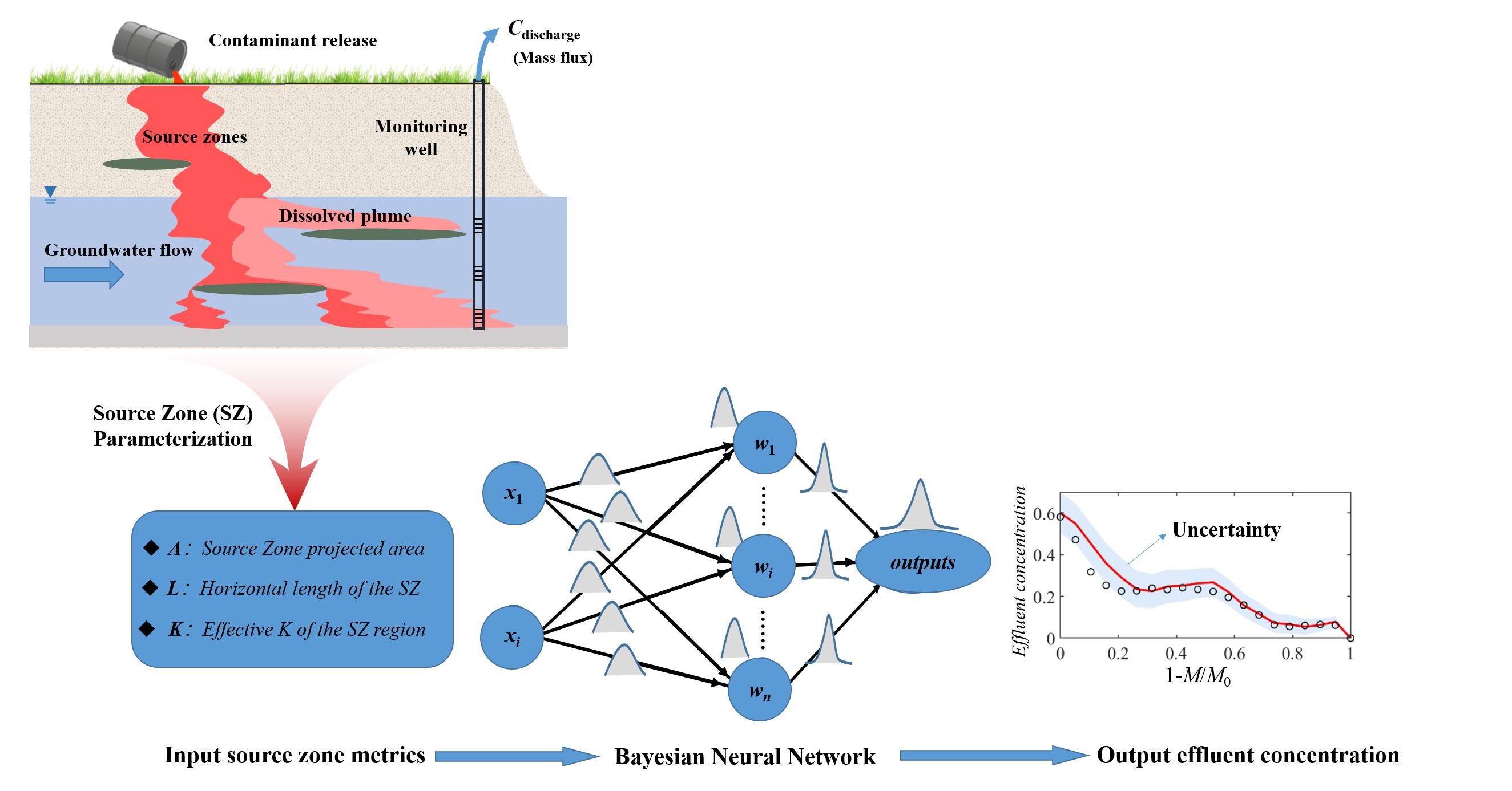 The abovementioned study was recently published in Water Resources Research, an prestigious journal in Hydrology and Water Resources, under the title “Modeling upscaled mass discharge from complex DNAPL source zones using a Bayesian Neural Network: prediction accuracy, uncertainty quantification and source zone feature importance”. Dr. Xueyuan Kang (Nanjing University) is the first author of the paper, Prof. Xiaoqing Shi and Prof. Jichun Wu are the co-corresponding authors. The co-authors include Prof. Amalia Kokkinaki (University of San Francisco), Prof. Jonghyun Lee (University of Hawaii), Prof. Guo Zhilin (Southern University of Science and Technology), and Dr. Lingling Ni (Nanjing Hydraulic Research Institute).This research was jointly funded by the National Natural Science Foundation of China and the AI & AI for Science Project of Nanjing University. The research group has previously developed a series of methods for high-resolution characterization/simulation of organic contaminant source zone architectures using machine learning (such as Kang et al., 2021WRR, 2022WRR). Based on these previous developed methods, this study (Kang et al., 2024) uses interpretable neural networks to help understand the mass transfer mechanism of organic contaminant source zone and establish an upscaled dissolution model. Combined with the aforementioned high-resolution characterization methods, it will better serve the management and control of contaminated sites.