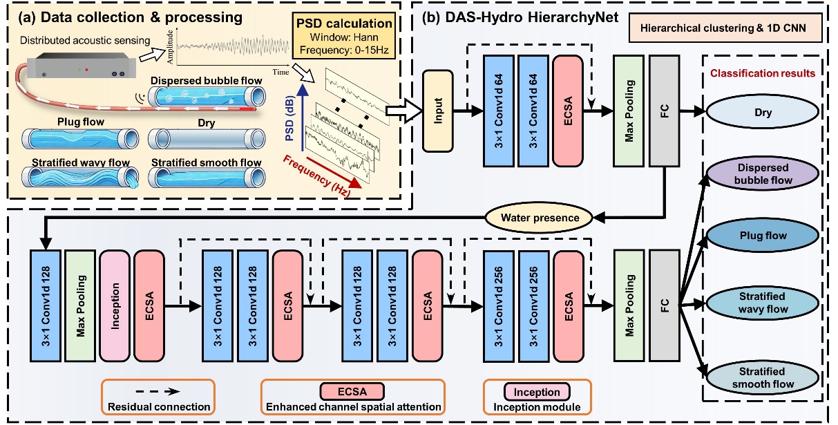 面对这一关乎国计民生的重大挑战,pg电子官方网站朱鸿鹄教授、谭道远副教授团队联合香港理工大学、香港城市大学、中山大学等知名高校,依托分布式光纤声波振动传感(DAS)技术,对地下输水隧洞流态识别这一世界级工程难题开展了深入研究。团队以国家重大水利工程、国家水网骨干工程——珠江三角洲水资源配置工程为示范点,在工程全线部署了高时空分辨率的光纤在线智能感知系统,首次实现了对输水盾构隧洞关键区域振动信号的精准、实时采集。基于原位监测数据,研究团队创新性地提出了融合分布式声波传感与深度学习算法的水流状态实时监测技术,并构建了名为“DAS-Hydro HierarchyNet”的分层聚类模型,大幅提升了流态识别的智能化和自动化水平。该技术不仅实现了对“气泡流”“塞流”“分层波动流”“分层平稳流”等典型流态的精准识别,还显著增强了对复杂流态变化的动态感知能力。团队进一步运用SHAP方法对模型的决策过程进行频谱解释分析,揭示了不同流态与声学频谱特征之间的内在联系。该成果为大型引调水工程运行管理提供了实时、连续、智能的状态感知与风险预警手段,显著提升了该类工程的安全裕度与运维效率,为粤港澳大湾区供水系统的智能化升级提供了坚实的技术支撑,也为全球韧性城市生命线建设贡献了可复制、可推广的“中国方案”。