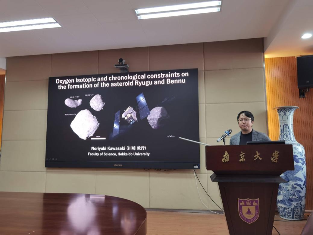10月23日上午,Kawasaki副教授在仙林校区举行题为“Oxygen isotopic and chronological constraints on the formation of the asteroids Ryugu and Bennu”的学术报告,分享了关于碳质小行星龙宫(Ryugu)和本努(Bennu)的最新研究成果,涵盖岩石学、原位高精度氧同位素和年代学的结果,为理解早期太阳系的演化提供了关键线索。鲍惠铭教授、李伟强教授和曹晓斌教授等院内外师生三十多人参加了学术报告和交流。