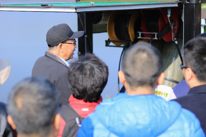 第二阶段,参会人员一同参观了中国地震局地球物理研究所**震源组、东方地球物理公司可控震源车组、中国地震局郑州物探中心二维密集地震数据采集组、中国工程物理研究院(绵阳九院)甲烷震源的工作,四家单位分别向参会人员介绍了各自不同方法的工作原理,展示了测试过程,演示了信息采集与处理方法。此外,大家还参观了朱溪铜钨矿项目部岩芯库。